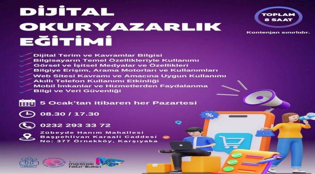 İzmir Büyükşehir Belediyesi, kadınlar için dijital okuryazarlık eğitimi düzenliyor. Meslek Fabrikası’nda yapılacak eğitimler ile katılımcıların dijital dünyada bilgiye erişim, güvenli kullanım ve temel teknoloji becerilerinin güçlendirilmesi hedefleniyor.